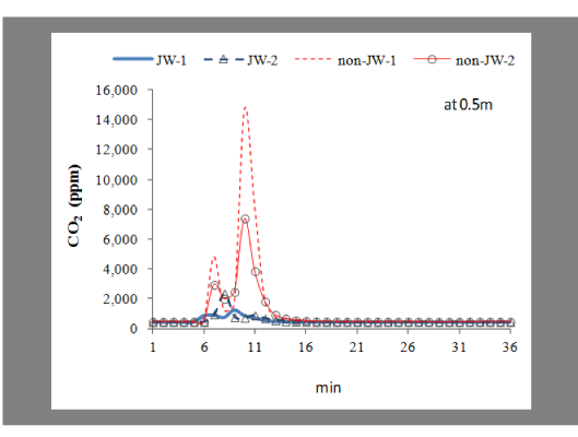 At 0.5m height, the averaged level of CO2 over the JW pavement is about 84% lower than that over the non-JW pavement.
